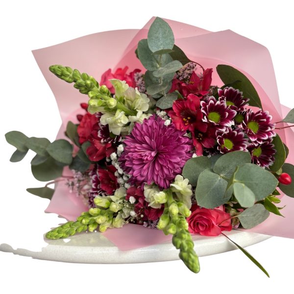 Um bouquet com anastacias, margaridas, boca de lobo, altromenias e verdes.