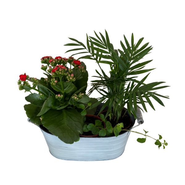 Um arranjo com palmeira, kalanchoe e era.