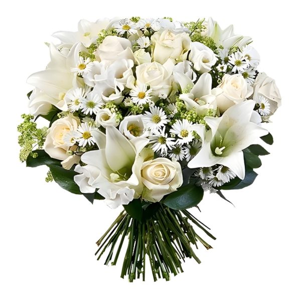 Um bouquet com rosas, camomilas, lilium e verdes.